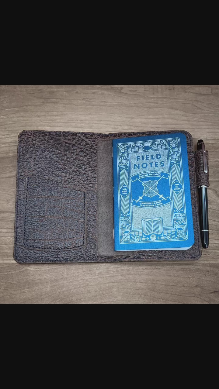 Ready to ship hand made notebook cover in brown shrunken bisen leather. This cover fits 3 1/2” x 5 1/2” notebooks including Field Notes and Moleskine. It has an interior pocket sized for both business cards and credit cards. The pen holder comfortably fits pens including the Montblanc Meisterstück as shown and the Pilot G2.