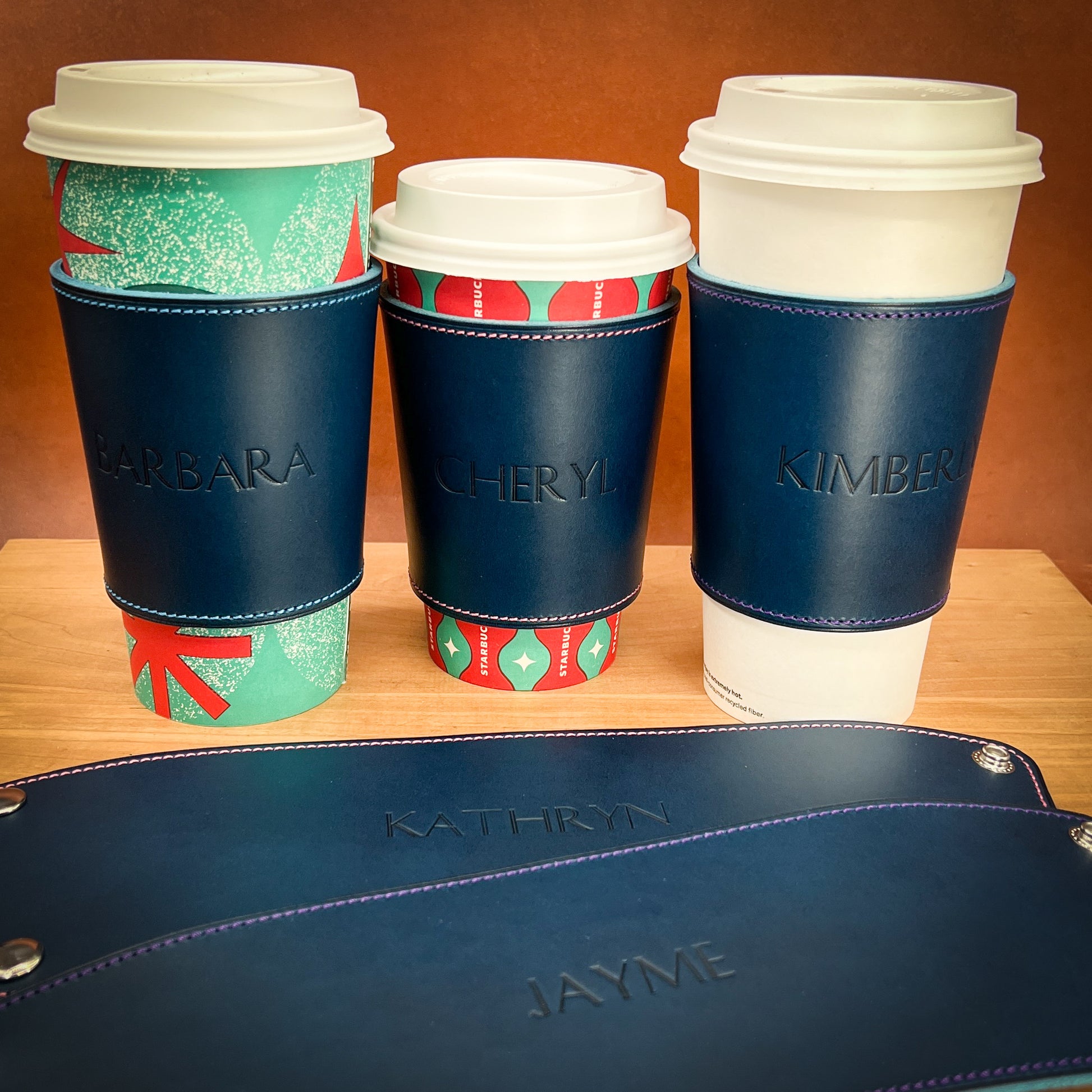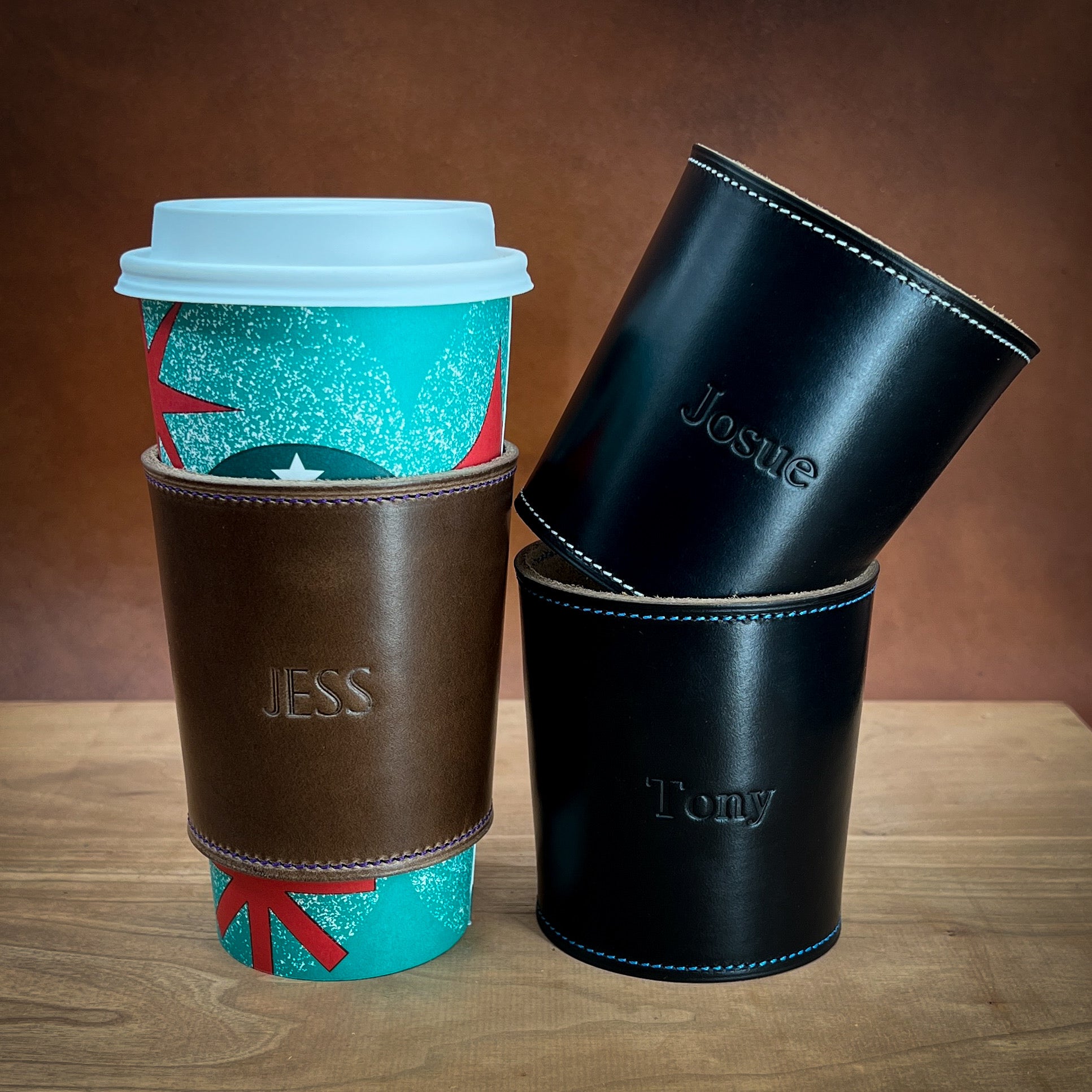 Handmade to order personalized coffee cup sleeves in luxury American Horween leathers with premium snaps. Choose your Horween leather, thread color and monogram font. Fits Black Rifle Coffee, Starbucks Grande & Venti and similar sized cups.