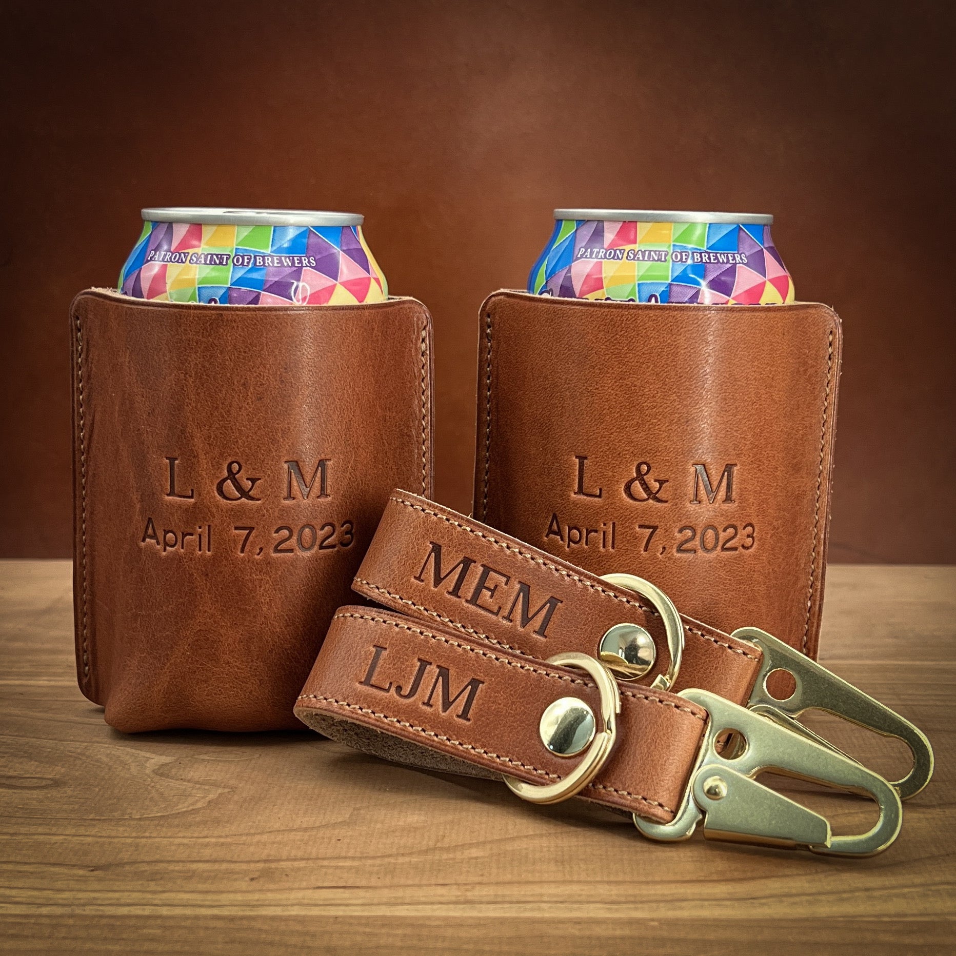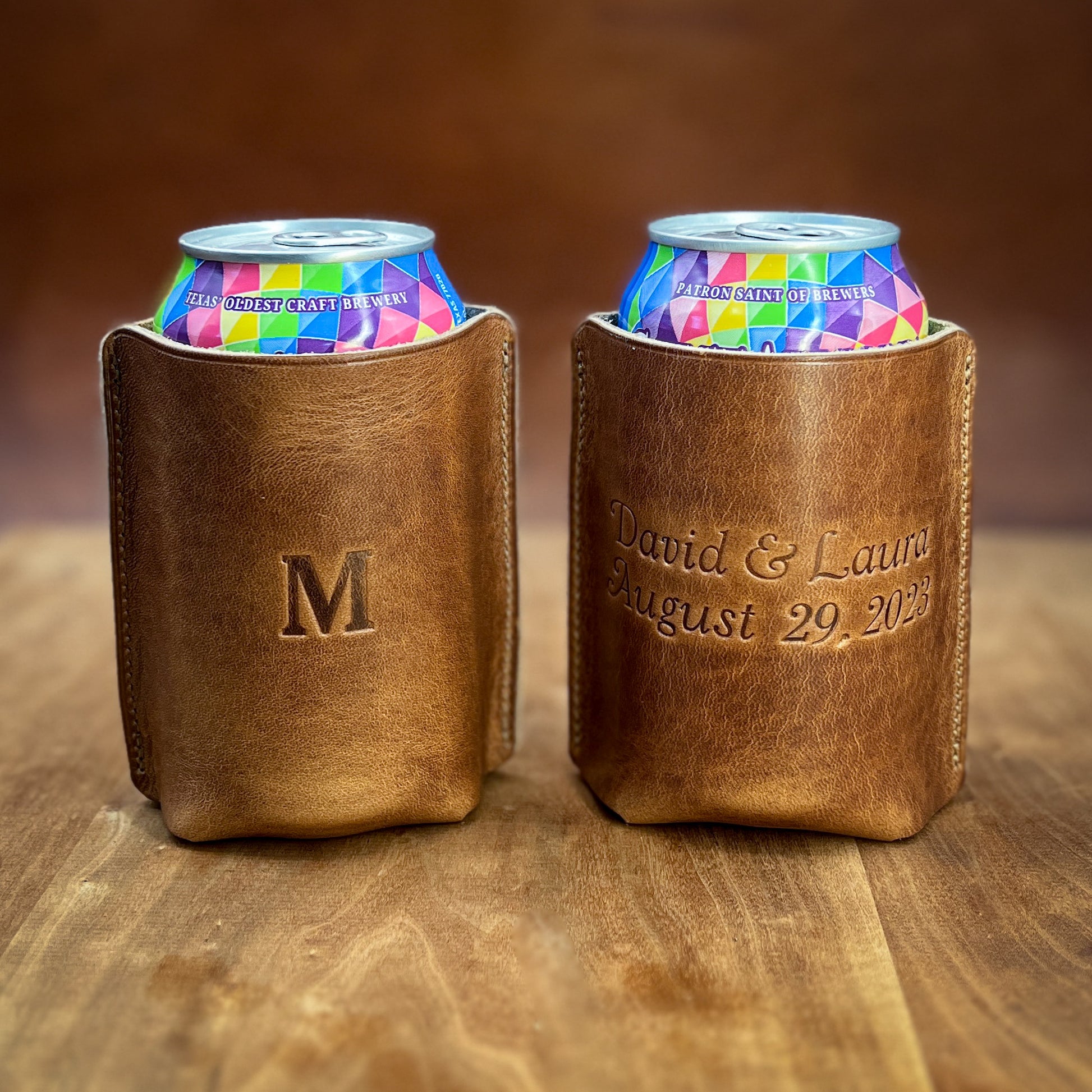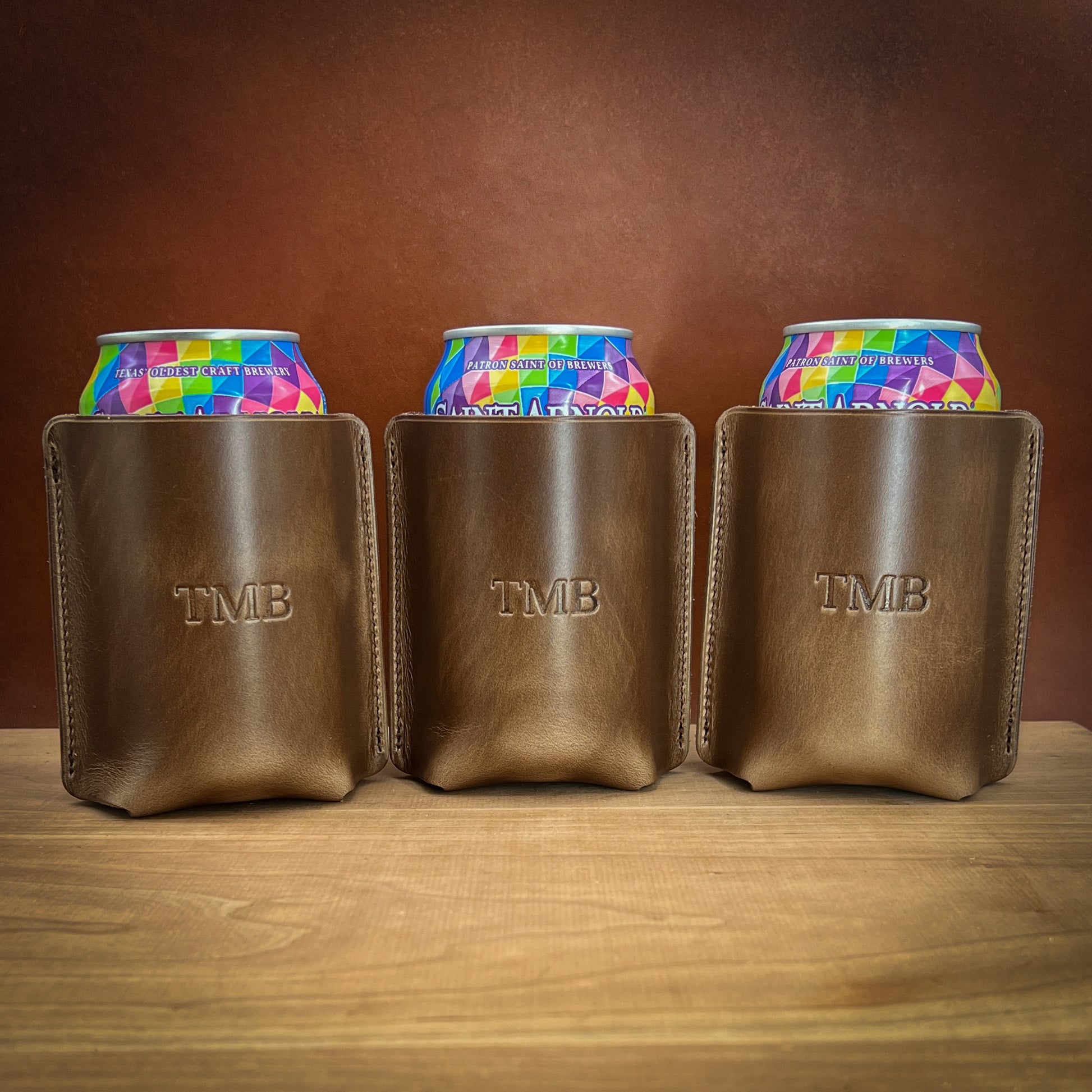 Handmade can and bottle drink sleeves in luxury Horween leathers.